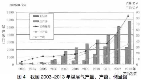 我國2003~2013 年煤層氣產(chǎn)量、產(chǎn)能及儲量見圖4。截至2015 年底,累計鉆直井15740口、水平井521 口,其中2015年鉆直井585 口、水平井89 口。2015 年,煤層氣地面開發(fā)商品氣量44 億m3,井下開發(fā)135.7 億m3。國家能源局2015 年2 月3 日發(fā)布的《煤層氣勘探開發(fā)行動計劃》指出,到2020 年,將建成3~4個煤層氣產(chǎn)業(yè)化基地,新增煤層氣探明地質(zhì)儲量1 萬億m3; 煤層氣年抽采量力爭達到400 億m3。